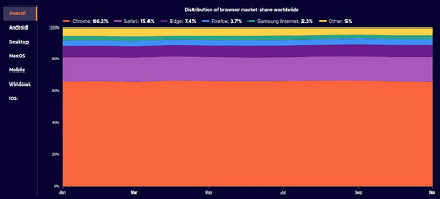 Inside the US, the federal government's Digital Analytics Program (DAP), with its running count of the last 90 days of US government website visits, also has Chrome on top with 64.6%. That's followed by Safari with 22.8%, thanks to America's love affair with iPhones, then Edge's 7.4%, and Firefox limping in at an ever-declining 1.7%.