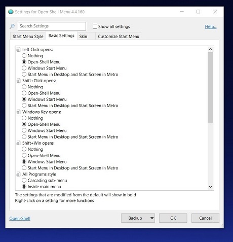 You can also open the 'Basic settings' menu of the Open shell to access the advanced settings, as shown in the screenshot below.