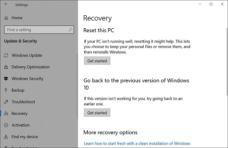 2. At the recovery screen, click on the 'Get started' button under 'Go back to the previous