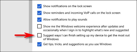 On the “Notifications & actions” screen, uncheck the “Suggest ways I can finish setting up my device to get the most out of Windows” box.