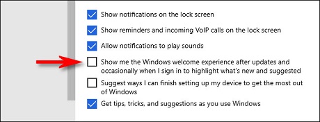 If you’d like to prevent another pop-up window after an update—one that suggests “What’s New” tips—you can also uncheck the box beside “Show me the Windows welcome experience after updates and occasionally when I sign in to highlight what’s new and suggested.”