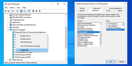 Preferred Band option available in the wireless adapter properties, you will have to force the change. Search the