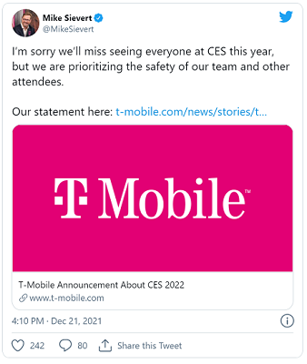 In its statement, CES staple T-Mobile said that while it is confident event organizers are taking precautionary steps it would nonetheless “significantly limit” its in-person presence in an effort to prioritize the safety of its team and others in attendance. Its departure means CEO Mike Sievert will also no longer offer his planned keynote speech.