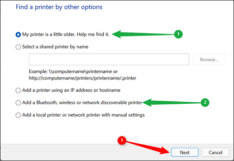 Select “My printer is a little older. Help me find it.” if you plugged your printer into your computer. If it is a network or other wireless printer, select “Add a Bluetooth, wireless or network discoverable printer