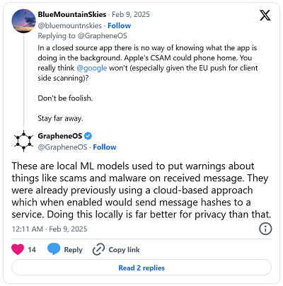 GrapheneOS, which specializes in hardening Android, has raised the wider potential of the Android System SafetyCore app launched by Google that makes all this work. “The app doesn't provide client-side scanning used to report things to Google or anyone else. It provides on-device machine learning models usable by applications to classify content as being spam, scams, malware, etc. This allows apps to check content locally without sharing it with a service and mark it with warnings for users.”