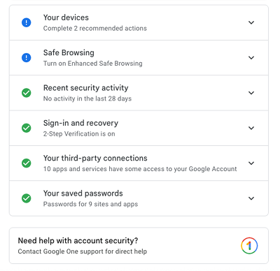 Google Security Checkup is number one on the Gmail account hacker defense list as it represents the most efficient way to ensure that a number of security protections are in place by checking what you already have and don’t have activated. Everything from two-factor authentication status to email forwarding activations and safe browsing controls is covered. Best of all, it is automatic, as soon as you land on the security checkup page, all the details have already been compiled and are waiting for you in an easy-to-use checklist format.