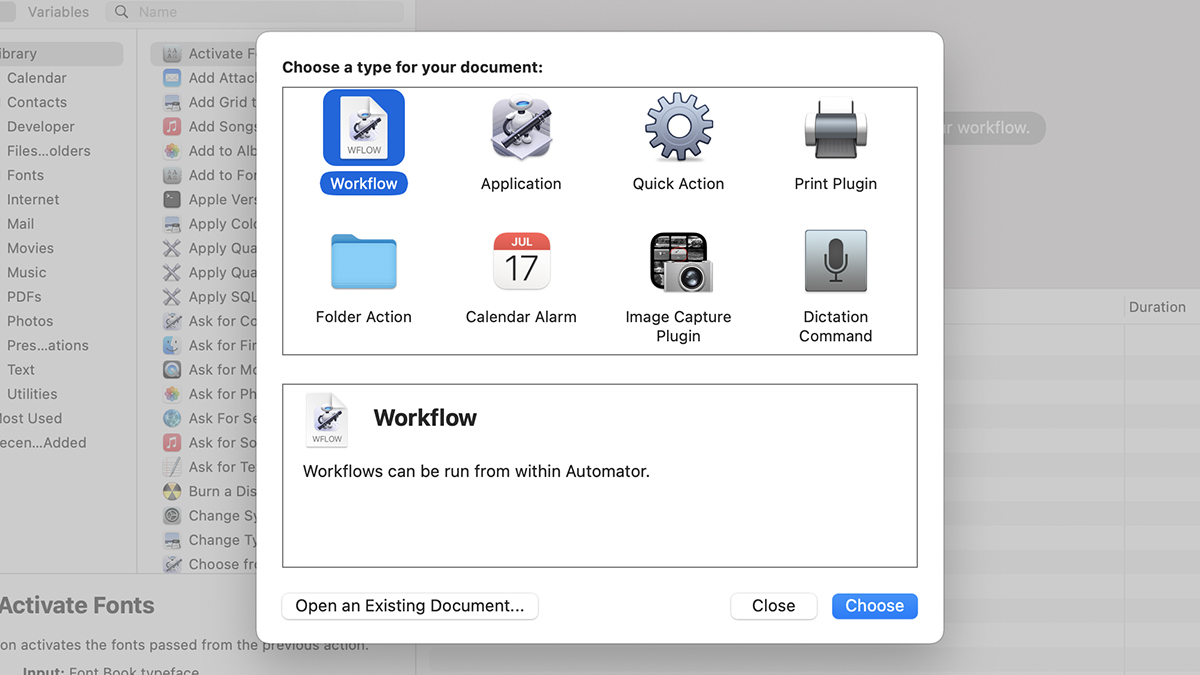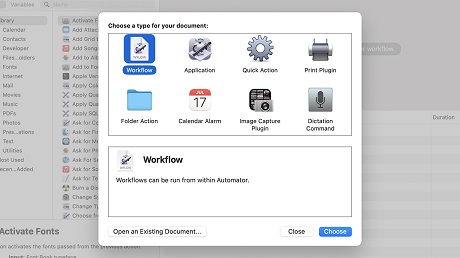 After you’ve launched Automator, you’ll be asked to create a new automated task, which is known as a workflow. You’ve got several different types to choose from: