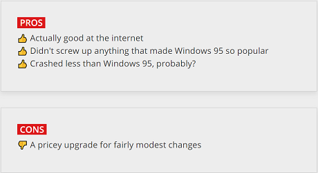 Andy: Windows 98 was just Windows 95 that worked properly. That may not sound like a big deal but you'd be surprised how much people appreciate that kind of incrementalism after two or three years of Win95's bullshit. It was so rock-solid that when ME came along I didn't even think about upgrading, which in hindsight was a bullet dodged but at the time was simply a testament to how right Windows 98 was.