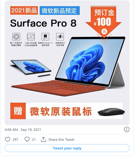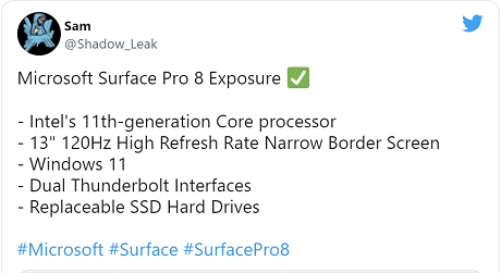 Microsoft is preparing to launch a new Surface Pro 8 model next week, and a leak appears to have revealed exactly what to expect. Twitter account Shadow_Leak has published a photo of the Surface Pro 8 from what appears to be a retail listing. The account claims the Surface Pro 8 will ship with a new 13-inch 120Hz display with narrow bezels and two Thunderbolt ports.