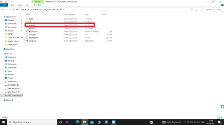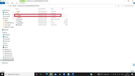 6. In the File Manager, open the USB drive with Windows 10 and navigate to the sources folder.