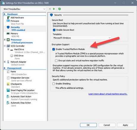 Select this checkbox to enable the virtual TPM required for a Windows 11 VM.