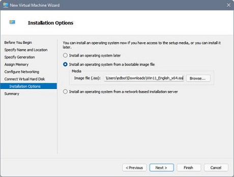 Specify the location of the Windows 11 installation file to automatically mount your ISO as a virtual DVD drive