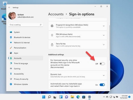 If you configured Windows to use a Microsoft account, you'll need to do one last tweak before you can sign on in an enhanced session and use your VM in full-screen mode: Go to Settings > Accounts > Sign-in Options and turn the Require Windows Hello Sign-in For Microsoft Accounts switch to the Off position.