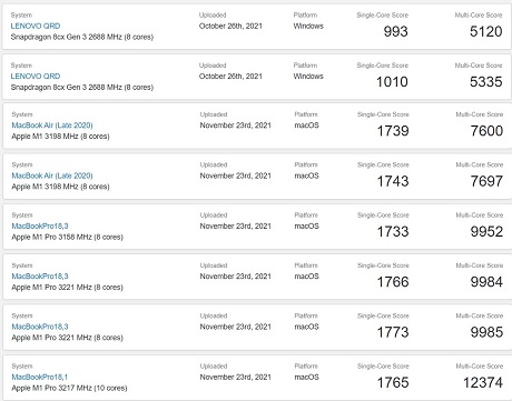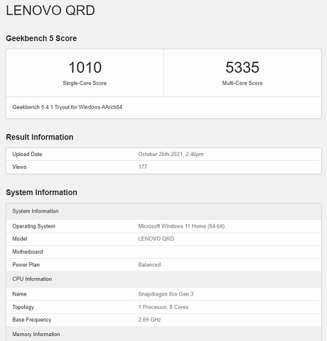 It’s worth pointing out that the GeekBench v5 listing is for Lenovo QRD, but it apparently has references to Snapdragon 8cx Gen 3 as well as Windows 11. In this case, it’s possible that QRD refers to the “Qualcomm Reference Device” which are test units that Qualcomm sells to its partners like Lenovo and Asus.