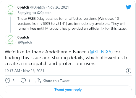 This is the second Windows zero-day that received a micropatch this month after Naceri found that patches for another bug (