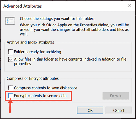 4. In the Advanced Attributes window, check the “Encrypt contents to secure data” option and click