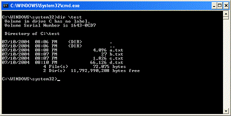 The DIR command - This command will list the files and directories contained in your current directory if used without an argument, or the directory you specify as an argument. To use the command you would just type dir and press enter and you will see a listing of the current files in the directory you are in, including information about their file sizes, date, and time they were last written to. The command will also show how much space the files in the directory are using and the total amount of free disk space available on the current hard drive. If I typed dir \test I would see the contents of the c:\test directory as shown in Figure 2 below.