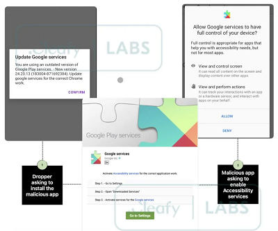 According to Cleafy, “the new app is deceptively named ‘Google Services’ and poses as a legitimate instance of Google Play Services. Upon launching, the app displays a window to ask the user to enable Accessibility services for the app.” This neat social engineering, disguising malware behind trusted names is unsurprisingly effective.