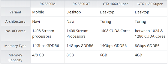 From the listing, it is noteworthy that the Radeon RX 5500 XT is equipped with 8GB of VRAM while the GeForce GTX 1660 and 1650 Super cards have 6GB and 4GB VRAM, respectively, just like their non-Super variants.