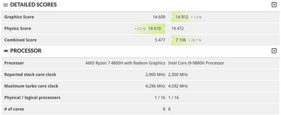 Now, this is not an apple to apple comparison since Ryzen 7 4800U is a 15W-25W chip while the Core i7-10750H is a 45W part so a better comparison would be this versus the Ryzen 7 4800H but we don't have 3DMark Timespy scores for the Ryzen 7 4800H. The only scores we have for that are in 3DMark Firestrike where the chip is on par with the Core i9-9880H. And finally, we have an entry for the Core i5-10300H which has a reported base clock of 2.50 GHz and an all-core boost of 4.30 GHz. There's also the Core i9-10880H processor which would feature a base clock of around 2.80 GHz across its 8 cores and 16 threads.