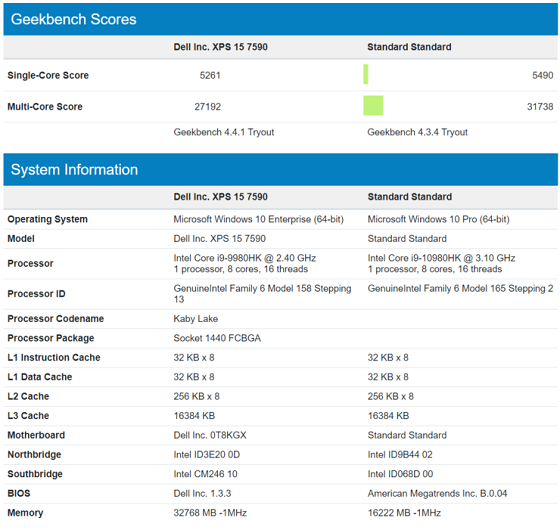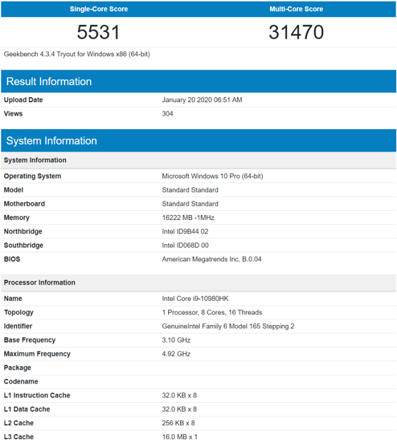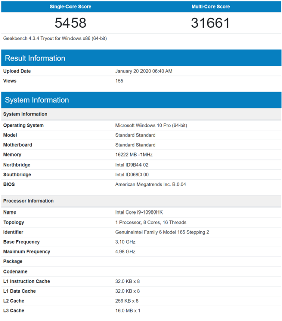 TUM_APISAK spotted three different benchmarks of the Core i9-10980HK in Geekbench 4 which report an average single-core score of around 5500 points and a multi-core score of around 31,600 points. This exceeds the performance of a desktop-grade AMD Ryzen 5 3600X by 3000 points in the multi-core tests but falls short by around 4000-5000 points when compared to the desktop-grade Ryzen 7 3700X. However, when compared to the Core 7-9700K, the chip is on par with the desktop Core i7 SKU in multi-core but lags behind in single-core. Compared to its predecessor, the Core i9-9980HK, we are looking at a 14% better multi-core and 5% better single-core performance. The tests can be seen below: