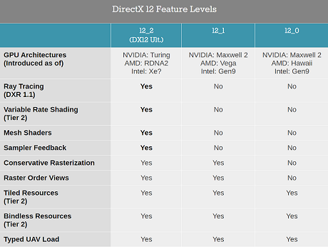All told – and much to the glee of NVIDIA – DirectX 12 Ultimate’s feature set ends up looking a whole heck of a lot like their Turing architecture’s graphics feature set. Ray tracing, mesh shading, and variable rate shading were all introduced for the first time on Turing, and this represents the current cutting edge for GPU graphics functionality. Consequently, it’s no mistake that this new feature level, which Microsoft is internally calling 12_2, follows the Turing blueprint so closely. Feature levels are a collaboration between Microsoft and all of the GPU vendors, with feature levels representing a common set of features that everyone can agree to support.