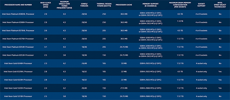 Intel's 3rd Gen Xeon Scalable Lineup3rd Generation Xeon Scalable processors are codenamed “Cooper Lake”. The new line-up consists of 11 processors, designed for 4 and 8 socket systems (Ice Lake-based processors coming a little later will target more common 1 and 2 socket platforms). Core counts range from 16 (32T) to 28 (56T), with up to 38.5MB of cache, and base/max single-core boost clocks ranging from 2.3GHz on up to 4.3GHz. These new Intel processors are not drop-in replacements from previous-gen parts, however. 3rd Generation Xeon Scalable processors require a new platform (Cedar Island) and LGA4189 socket.