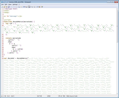 When viewing the attachment in a text editor, you can see that they include JavaScript that maps letters and numbers to Morse code. For example, the letter 'a' is mapped to '.-' and the letter 'b' is mapped to '-...', as shown below.