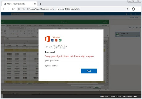 These injected scripts combined with the HTML attachment contain the various resources necessary to render a fake Excel spreadsheet that states their sign-in timed out and prompts them to enter their password again.