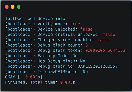 Newer Android versions allow developers to place the device in a locked state to prevent a device from loading modified boot images. As you can see below, the 'fastboot oem device-info' shows that the device is not unlocked.