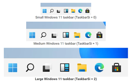 When configuring the TaskbarSi value, you can specify whether you want to show a small, medium, or large taskbar, with each size illustrated below.