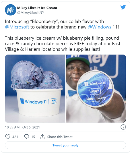 Working with Mike Likes It Ice Cream creamery, the company commissioned a Windows 11-branded Bloomsberry ice cream flavor, which you can pick up at their East Village and Harlem location for free today.