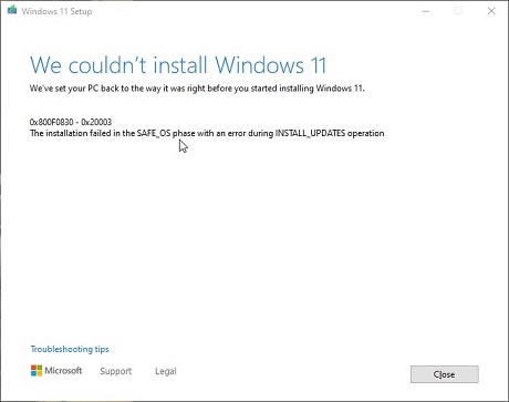 “Ox8COF0830 – ox2W03 The installation failed in the SAFE_OS phase with an error during INSTALL_UPDATES operation,” the error message reads. This issue also appears to be related to drivers, and a proper workaround is not available.