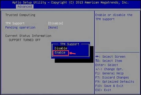 5. Enable the TPM and press F10 to Save & Exit.