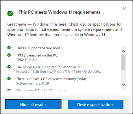 See all results to know in detail about the hardware configuration of your device that matches with the Windows 11 demands.