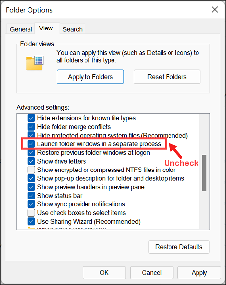 Launch folder windows in a separate process option are unchecked.