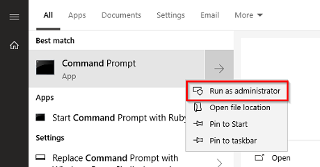 1. From the Windows search bar, search and launch the Command Prompt with administrator rights.