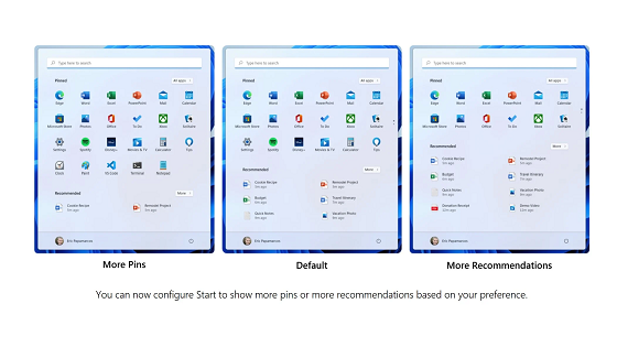 As the name suggests, the first option “More pins” allows you to have more app shortcuts on the Start. On the other hand, the second option lets you configure Start to show more recommendations based on your preference. These new options will help show an extra row of pins or recommendations.
