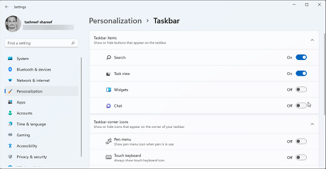 3. Under Taskbar items, toggle the switch for Widgets and Chat and set it to