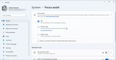 You can also set automatic rules to start Focus Assist during set hours and while doing specific activities.
