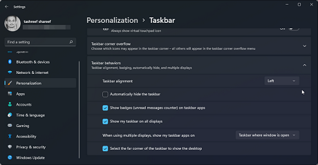 4. Click the drop-down for Taskbar alignment and select Left. Windows 11 Taskbar will now