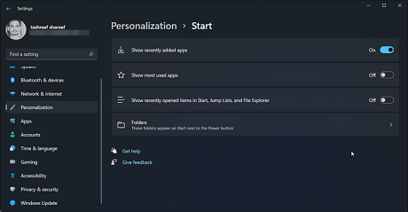 6. Go to Personalization > Start and toggle the switch for Show recently added