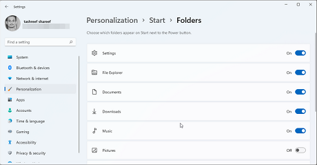 4. Here, you can choose which folders appear on Start next to the Power button. To