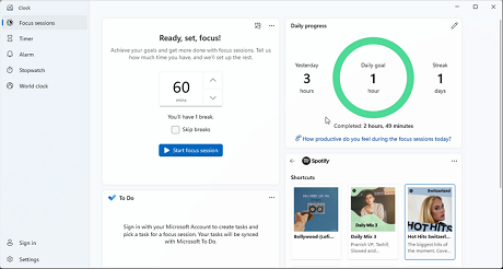 Windows 11’s new clock app features a Focus Sessions tab. This tool is a handy productivity-focused feature that can help you build healthy digital habits, set daily goals, and challenge yourself. When you open the Focus Session tab, you will see a focus timer, your daily progress report, and the options to sync your Spotify playlist and Microsoft To-Do account.