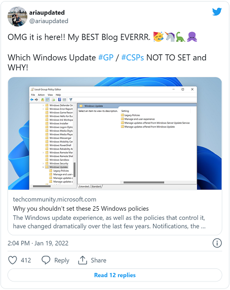 Writing on the Windows IT Pro blog in what she describes as "My BEST Blog EVERRR", Aria Carley reveals a total of 25 policies that Windows 11 admins should not use; she points out that the same advice also applies to Windows 10 version 20H2 and above.