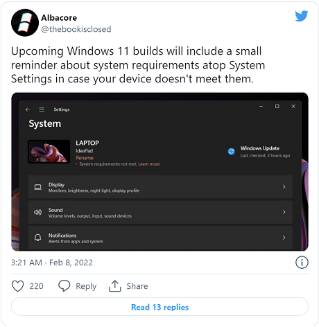 The somewhat strange decision by Microsoft has been brought to light by Albacore, the same software explorer who recently revealed more Windows 11 secrets. In a screenshot shared on Twitter, it is possible to see the warning that is being tested internally at Microsoft, and is destined to be displayed on the System pages of the Settings app: