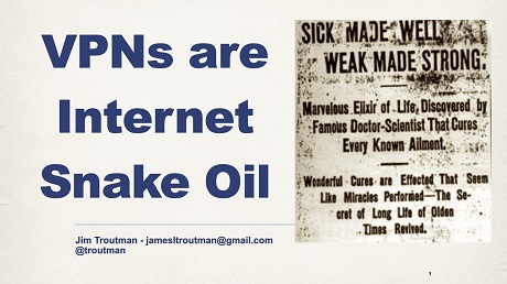 "VPNs are internet snake oil," Troutman said, comparing them to the worthless miracle cures that traveling salesmen used to peddle at the turn of the 20th century.