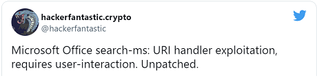 This was seen yesterday when Hickey converted existing Microsoft Word MSDT exploits to use the search-ms protocol handler we described earlier.