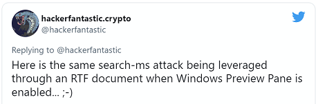 Like the MSDT exploits, Hickey also showed that you could create RTF versions that automatically open a Windows Search window when the document is rendered in the Explorer preview pane.