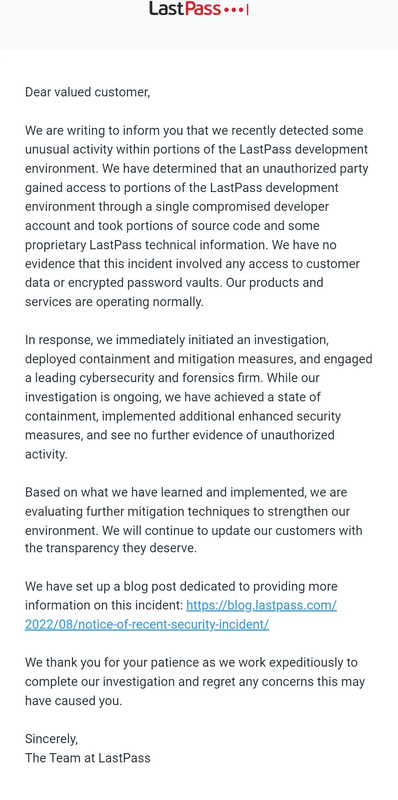 "In response to the incident, we have deployed containment and mitigation measures, and engaged a leading cybersecurity and forensics firm," explains the LastPass advisory.